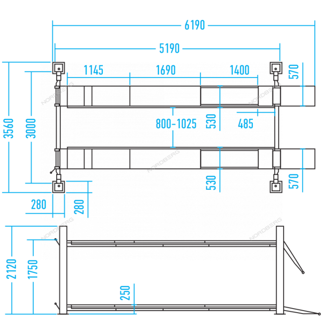 - Высота подъема - 250 - 1750 мм